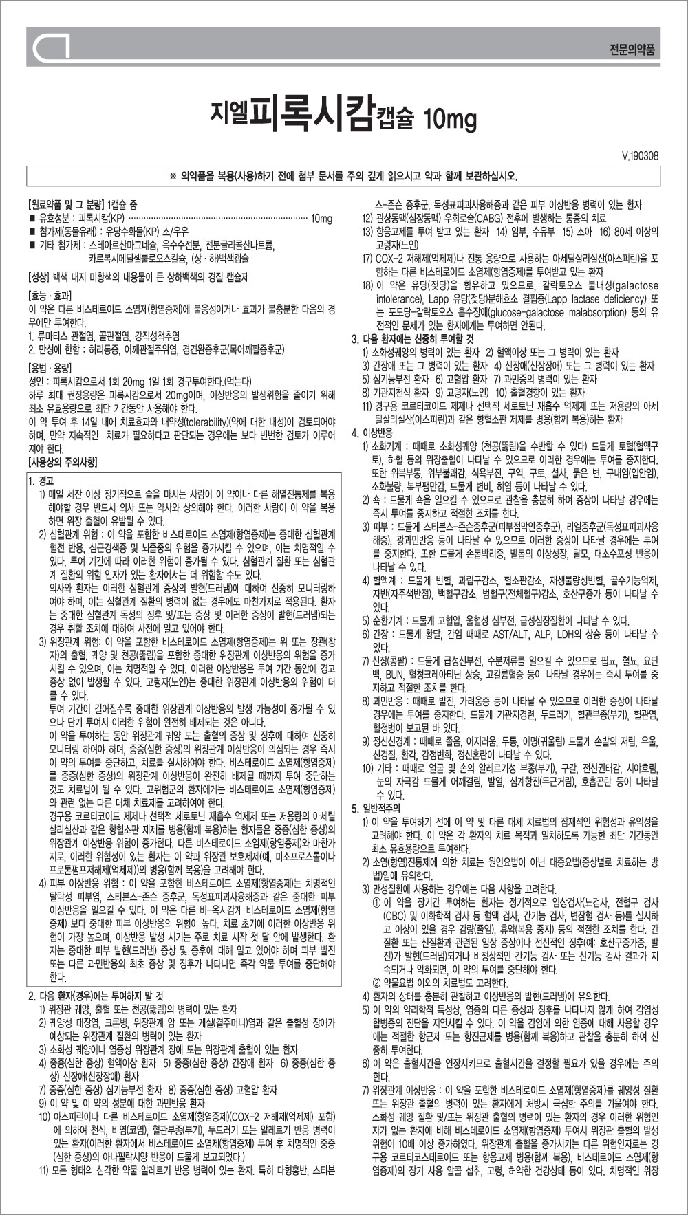 03) 위장관계 위험 : 이 약을 포함한 비스테로이드 소염제는 위 또는 장관의 출혈, 궤양 및 천공을 포함한 중대한 위장관계 이상반응의 위험을 증가시킬 수 있으며 이는 치명적일 수 있다. 이러한 이상반응은 투여 기간 동안에 경고 증상 없이 발생할 수 있다. 고령자는 중대한 위장관계 이상반응의 위험이 더 클 수 있다. 투여 기간이 길어질수록 중대한 위장관계 이상반응의 발생 가능성이 증가될 수 있으나 단기 투여시 이러한 위험이 완전히 배제되는 것은 아니다. 이 약을 투여하는 동안 위장관계 궤양 또는 출혈의 증상 및 징후에 대하여 신중히 모니터링 하여야 하며 중증의 위장관계 이상반응이 의심되는 경우 즉시 이 약의 투여를 중단하고 치료를 실시하여야 한다. 비스테로이드 소염제를 중증의 위장관계 이상반응이 완전히 배제될 때까지 투여 중단하는 것도 치료법이 될 수 있다. 고위험군의 환자에게는 비스테로이드 소염제와 관련 없는 다른 대체 치료제를 고려하여야 한다. 경구용 코르티코이드 제제나 선택적 세로토닌 재흡수 억제제 또는 저용량의 아세틸살리실산과 같은 항혈소판 제제를 병용하는 환자들은 중증의 위장관계 이상반응 위험이 증가한다. 다른 비스테로이드 소염제와 마찬가지로 이러한 위험성이 있는 환자는 이 약과 위장관 보호제제(예 : 미소프로스톨이나 프로톤펌프저해제)의 병용을 고려해야 한다.