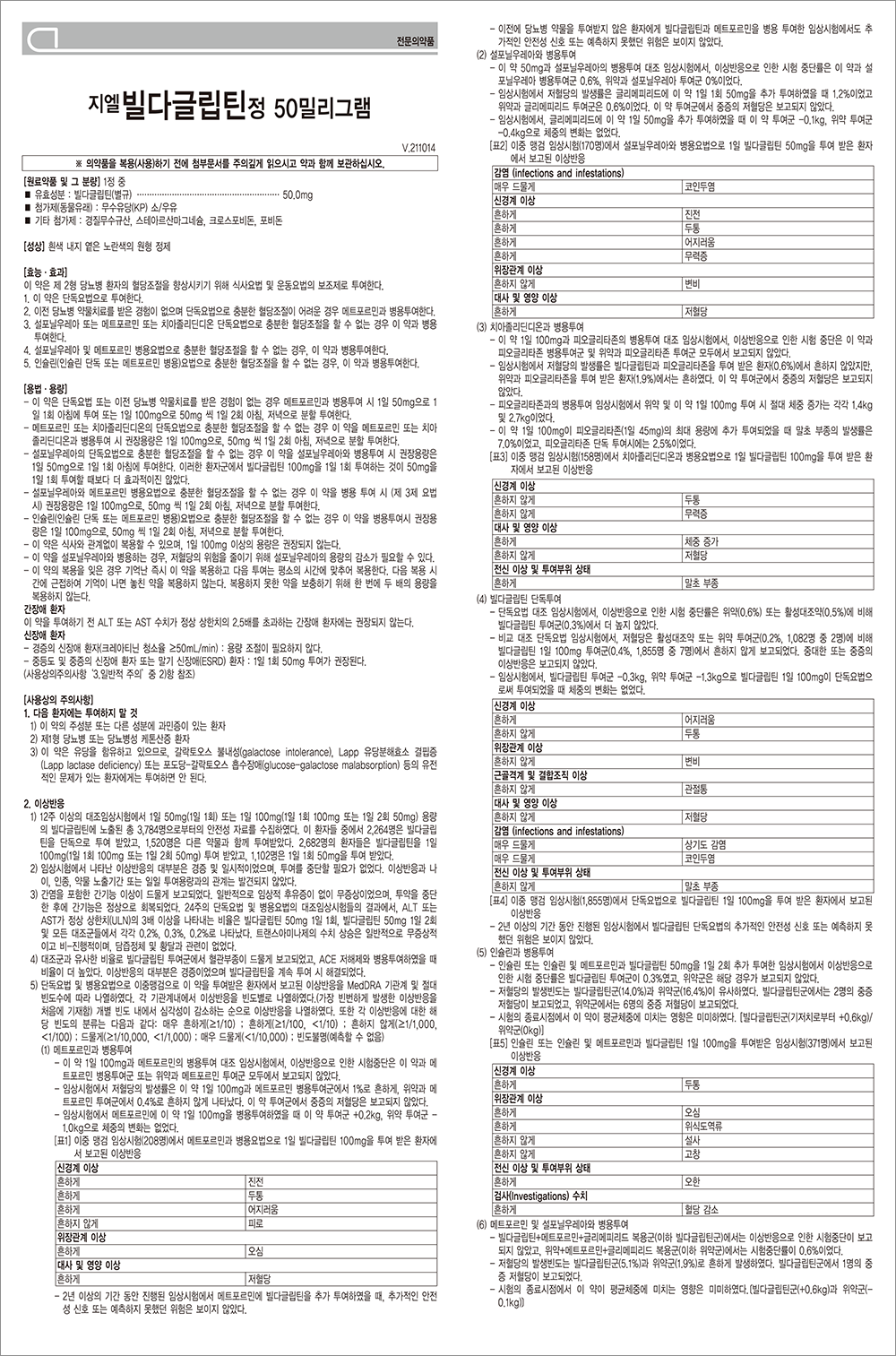 03) 간염을 포함한 간기능 이상이 드물게 보고되었다. 일반적으로 임상적 후유증이 없이 무증상이었으며 투약을 중단한 후에 간기능은 정상으로 회복되었다. 24주의 단독요법 및 병용요법의 대조임상시험들의 결과에서 ALT 또는 AST가 정상 상한치 (ULN)의 3배 이상을 나타내는 비율은 빌다글립틴 50mg 1일 1회, 빌다글립틴 50mg 1일 2회 및 모든 대조군들에서 각각 0.2%, 0.3%, 0.2%로 나타났다. 트랜스아미나제의 수치 상승은 일반적으로 무증상적이고 비 - 진행적이며 담즙정체 및 황달과 관련이 없었다.
