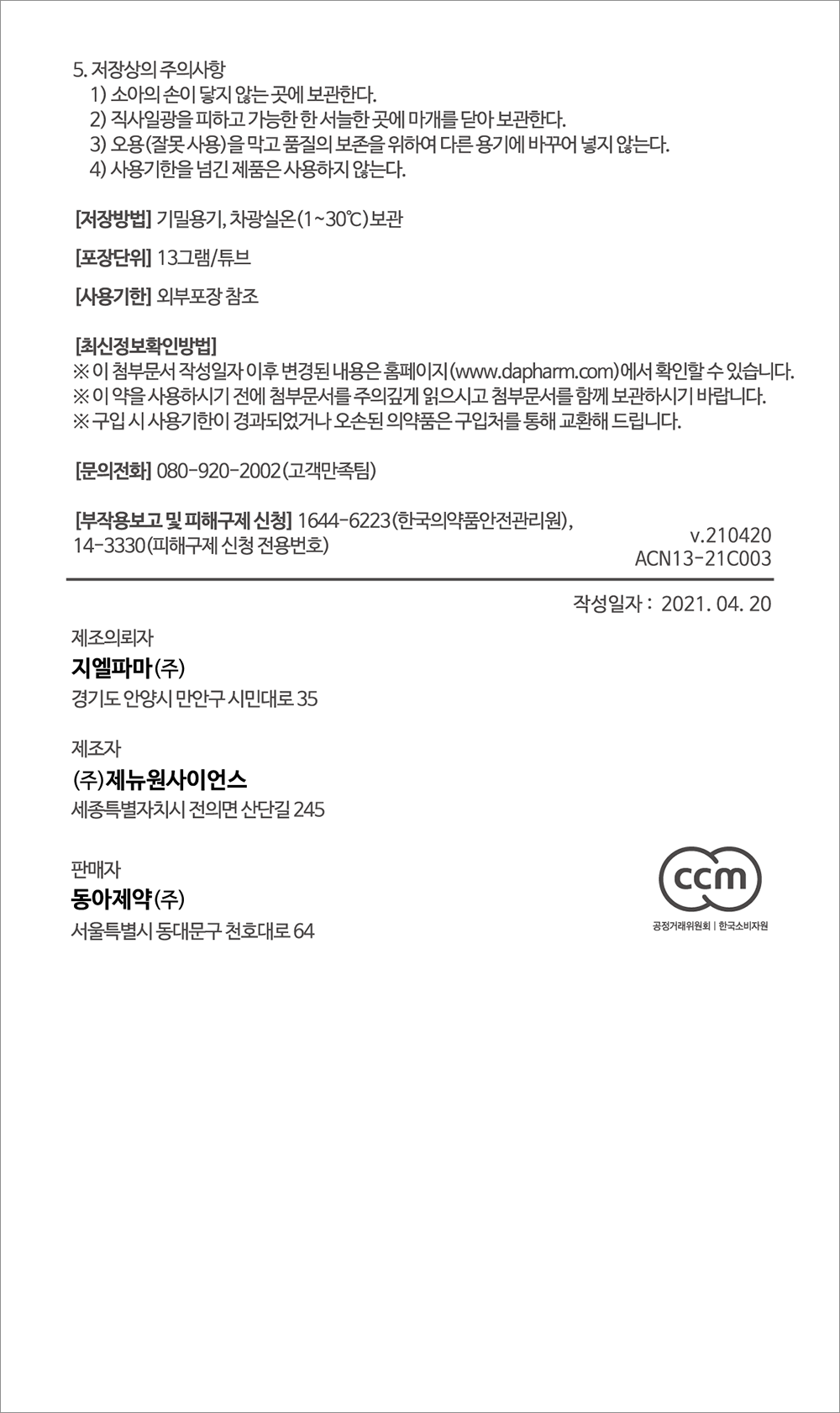 비누 등으로 세안 후 적당량을 적당량을 1일 수회 환부(질환 부위)에 도포한다.