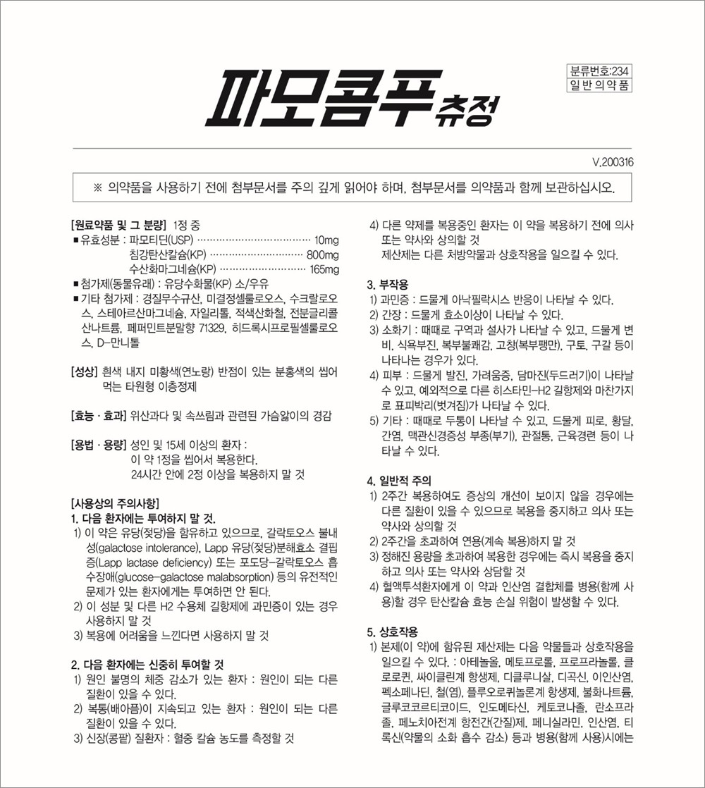 수산화마그네슘 165mg, 침강탄산칼슘 800mg, 파모티딘 10mg
