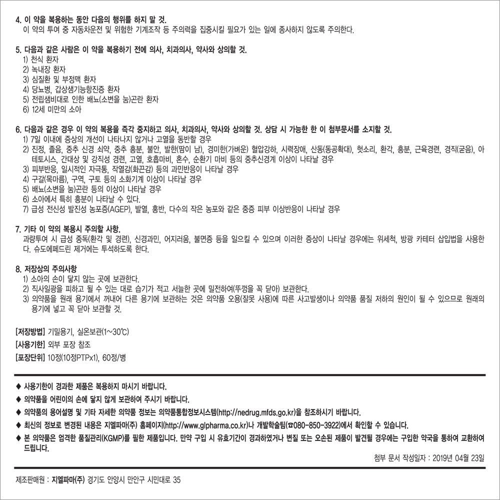 슈도에페드린 함유 의약품 복용시 급성 전신성 발진성 농포증(AGEP)과 같은 중증 피부 이상반응이 나타날 수 있다. 발열, 홍반, 다수의 작은 농포와 같은 증상이 관찰될 경우 이 약의 복용을 중단하고 의사 또는 약사와 상의해야 한다.