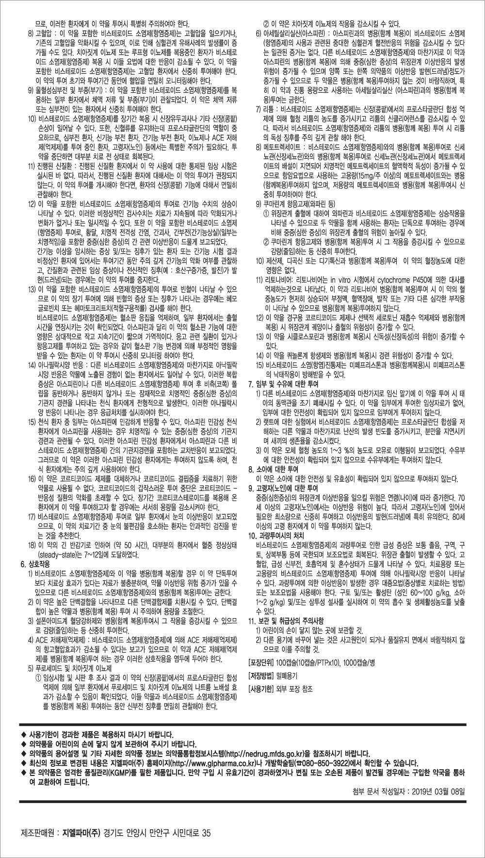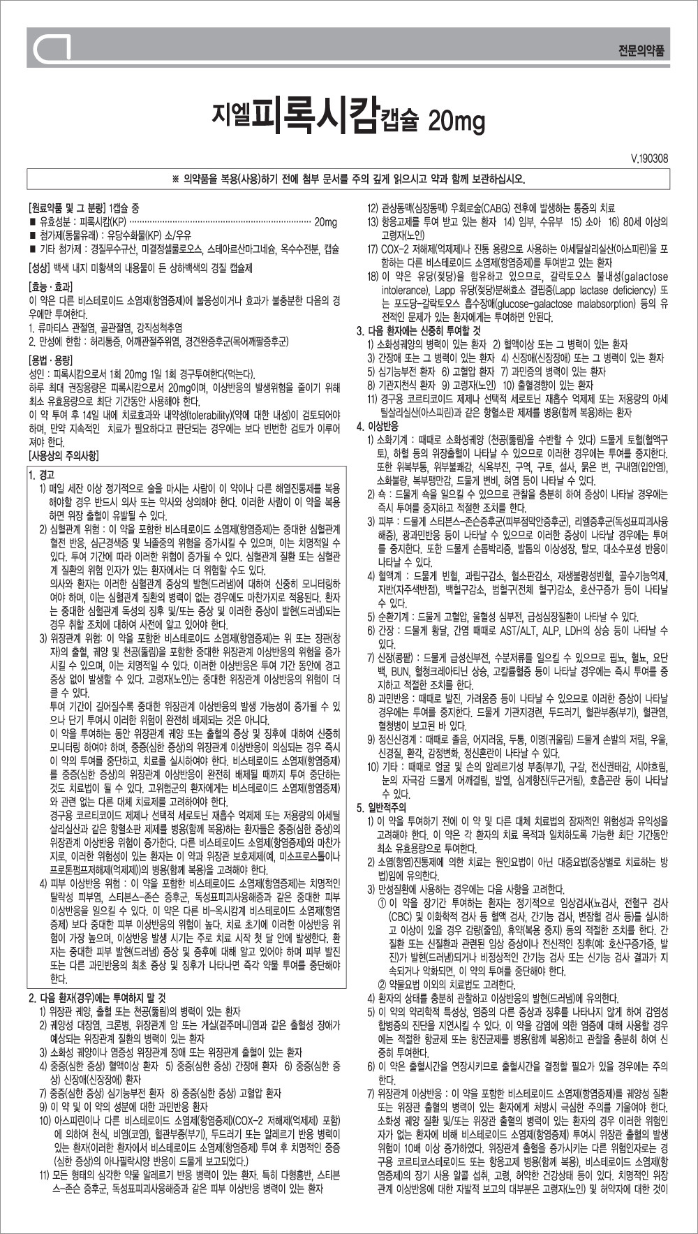 03) 위장관계 위험 : 이 약을 포함한 비스테로이드 소염제는 위 또는 장관의 출혈, 궤양 및 천공을 포함한 중대한 위장관계 이상반응의 위험을 증가시킬 수 있으며 이는 치명적일 수 있다. 이러한 이상반응은 투여 기간 동안에 경고 증상 없이 발생할 수 있다. 고령자는 중대한 위장관계 이상반응의 위험이 더 클 수 있다. 투여 기간이 길어질수록 중대한 위장관계 이상반응의 발생 가능성이 증가될 수 있으나 단기 투여시 이러한 위험이 완전히 배제되는 것은 아니다. 이 약을 투여하는 동안 위장관계 궤양 또는 출혈의 증상 및 징후에 대하여 신중히 모니터링 하여야 하며 중증의 위장관계 이상반응이 의심되는 경우 즉시 이 약의 투여를 중단하고 치료를 실시하여야 한다. 비스테로이드 소염제를 중증의 위장관계 이상반응이 완전히 배제될 때까지 투여 중단하는 것도 치료법이 될 수 있다. 고위험군의 환자에게는 비스테로이드 소염제와 관련 없는 다른 대체 치료제를 고려하여야 한다. 경구용 코르티코이드 제제나 선택적 세로토닌 재흡수 억제제 또는 저용량의 아세틸살리실산과 같은 항혈소판 제제를 병용하는 환자들은 중증의 위장관계 이상반응 위험이 증가한다. 다른 비스테로이드 소염제와 마찬가지로 이러한 위험성이 있는 환자는 이 약과 위장관 보호제제(예 : 미소프로스톨이나 프로톤펌프저해제)의 병용을 고려해야 한다.