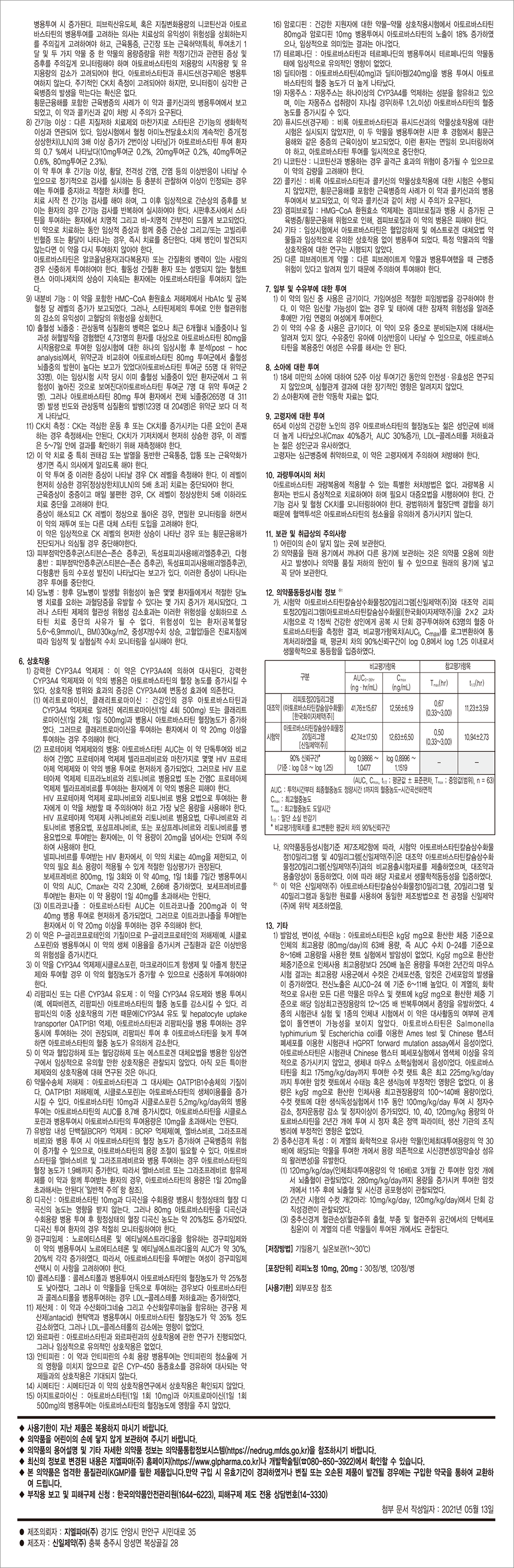 07) 유방암 내성 단백질 (BCRP) 억제제 : BCRP 억제제 (예 : 엘바스비르, 그라조프레비르)와 병용 투여 시 아토르바스타틴의 혈장 농도가 증가하여 근육병증의 위험이 증가할 수 있으므로 아토르바스타틴의 용량 조절이 필요할 수 있다. 아토르바스타틴을 엘바스비르 및 그라조프레비르와 병용 투여하는 경우 아토르바스타틴의 혈장 농도가 1.9배까지 증가한다. 따라서 엘바스비르 또는 그라조프레비르 함유제제를 이 약과 함께 투여받는 환자의 경우 아토르바스타틴의 용량은 1일 20mg을 초과해서는 안된다.(일반적 주의 참조)