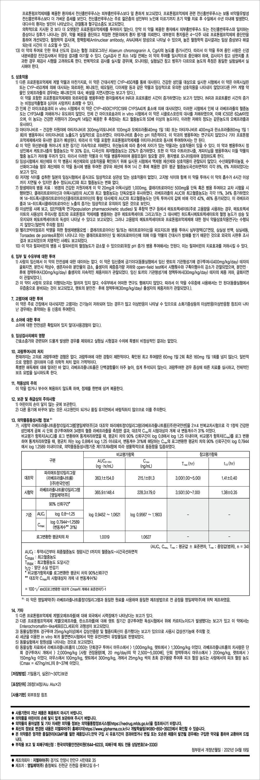 시험약 라베프라졸나트륨정10밀리그램[영일제약(주)]과 대조약 파리에트정10밀리그람(라베프라졸나트륨)[(주)한국얀센]을 2×4 반복교차시험으로 각 1정씩 건강한 성인에게 공복 시 단회 경구투여하여 34명의 혈중 라베프라졸을 측정한 결과 대조약 Cmax의 시험대상자 개체 내 변동계수가 31% 이었다. 비교평가 항목치(AUCt)를 로그 변환하여 통계처리하였을 때 평균치 차의 90% 신뢰구간이 log 0.8에서 log 1.25 이내이며 비교평가 항목치(Cmax)를 로그 변환하여 통계처리하였을 때 평균치 차는 log 0.8에서 log 1.25 이내로서 변동계수 31%에 해당하는 Cmax의 로그변환한 평균치 차의 90% 신뢰구간이 log 0.7944에서 log 1.2589 이내이므로 의약품동등성시험기준 제17조제4항에 따라 생물학적으로 동등함을 입증하였다.