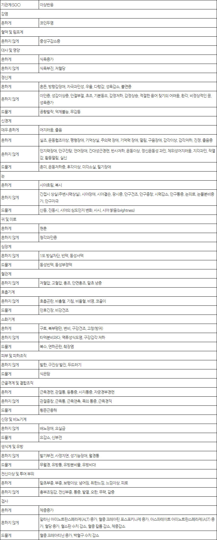 아래의 표에 기재된 이상반응은 기저질환 및/혹은 병용약물과 연관되어 나타날 수도 있다.