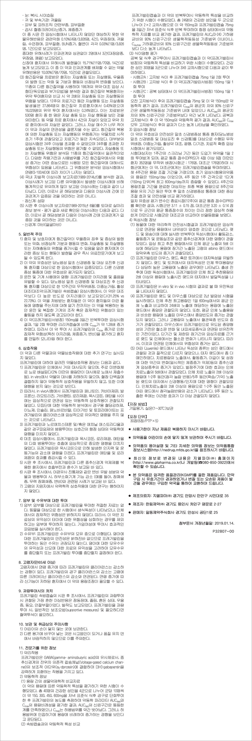 02) 따라서, in vivo시험에서 프레가발린과 페니토인, 카바마제핀, 발프론산, 라모트리진, 가바펜틴, 로라제팜, 옥시코돈, 에탄올 사이에는 임상적으로 연관성 있는 약동학적 상호작용이 관찰되지 않았다. 모집단에 대한 약동학적 분석에서 경구용 혈당강하제, 이뇨제, 인슐린, 페노바르비탈, 티아가빈 및 토피라메이트는 프레가발린의 클리어런스에 임상적으로 유의적인 영향을 주지 않는 것으로 나타났다.